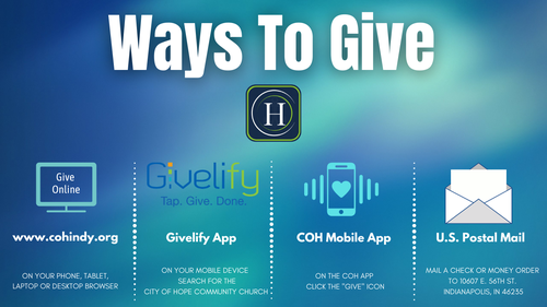 The foundation of our faith is built on giving! John 3:16 says for God so loved the world that He gave his only begotten son… Galatians 1:4 talks about how Jesus gave his life for our sins. The entire foundation of our faith is built on giving! One of our core values at The City of Hope Community Church is sacrificial generosity. We give generously because Jesus gave sacrificially. Your generosity at The City of Hope enables us to Live Out The Great Commandment, Carry Out The Great Commission and to serve our city, our nation and our world, with compassion, honor, excellence and respect.